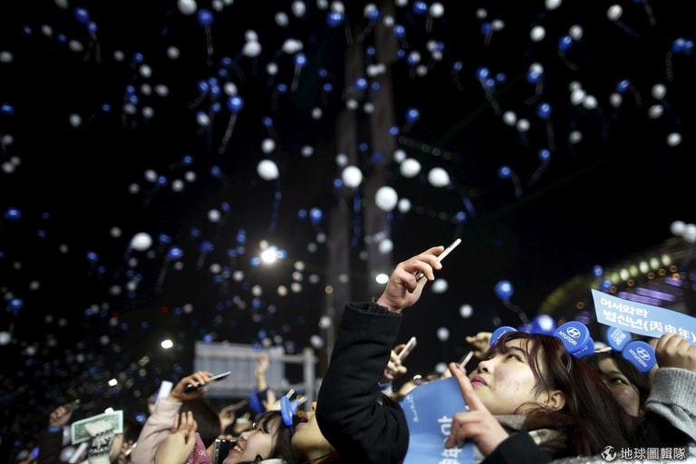 首爾市區出現大量的跨年氣球,一位民眾趁機拍照留念。