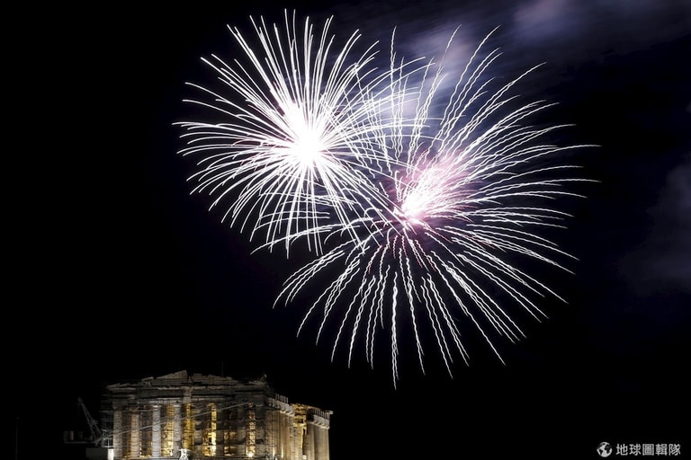 打上燈光的帕德嫩神廟與遠處煙火相映成趣。