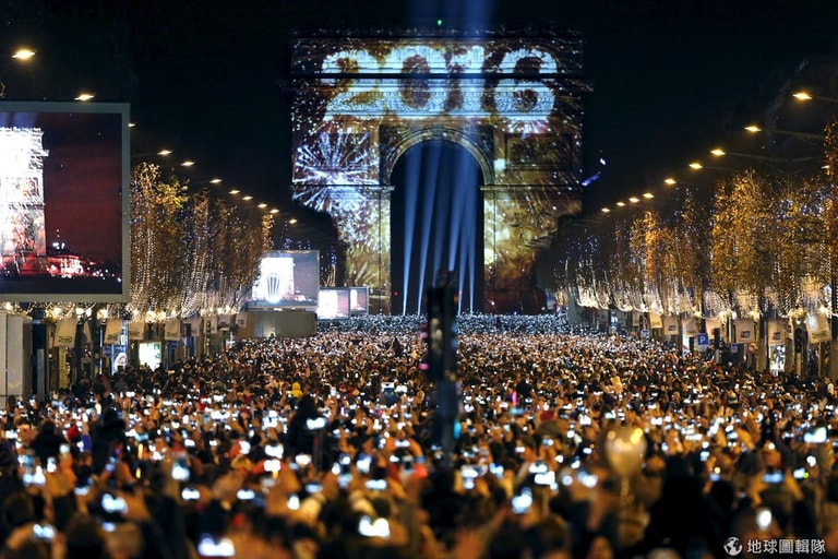 慶祝跨年的人們齊聚香榭大道,遠處可見燈光投射出煙火和 2016年字樣在凱旋門上。