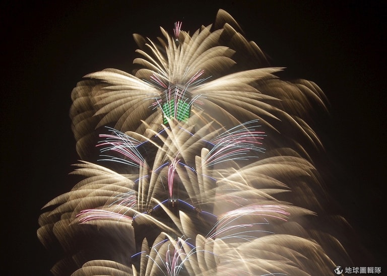 台北101在進入 2016年的瞬間綻放出美麗的煙火。