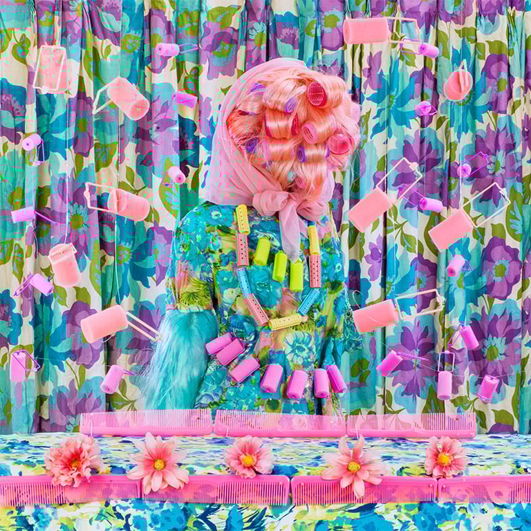 一塊塊色彩斑斕的布料,從頭到腳垂掛在牆壁上,待你走近一看才會發現這一塊塊花布中躲著個女人,這就是美國攝影師卡蘿(Patty Carroll)的〈沒有名字的女人〉(Anonymous Women)系列作品。卡蘿挑選的每一塊布料背後都代表女性被制約在傳統的性別角色中。過去,女人的責任就是挑選家中的地毯、布簾還有打造一個完美的家,對女人來說她們彷彿沒有名字,她們挑選的窗簾和布料的花樣取代了她們身為「人」的角色。