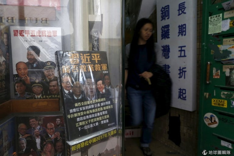 香港銅鑼灣書店販賣的書籍觸動中國當局的敏感神經,許多內容都與共產黨高層的內幕有關,圖中可以看到書店門口擺放了《習近平能否救黨救軍》、《習近平五虎將治軍》等書。