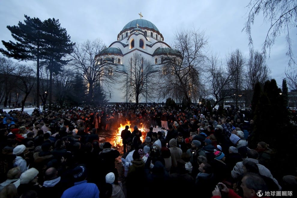 塞爾維亞人在聖薩瓦教堂(St. Sava temple)燃燒乾的橡樹枝,慶祝聖誕節。
