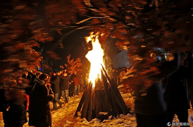 信奉東正教的人們,在教堂前面燃燒具有聖誕節意涵的橡樹枝(Yule log)。根據儒略曆(Julian calendar),每年當地的東正教信徒會在 1月7日左右慶祝聖誕節的到來。