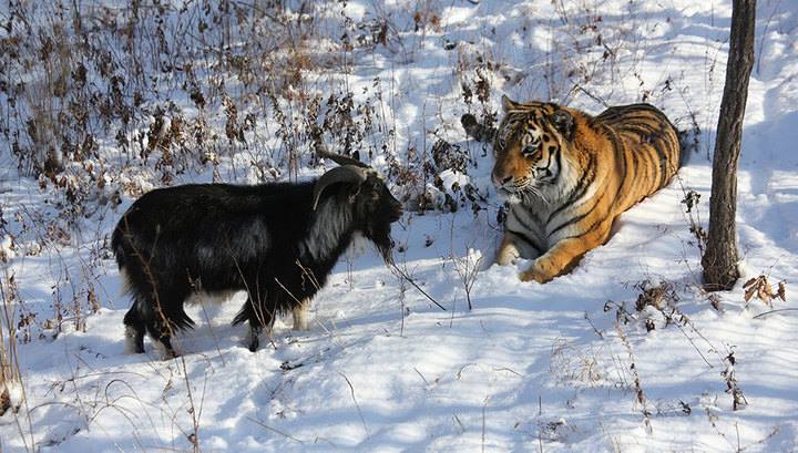 俄國的普莫斯基野生動物園(Primorsky safari park)送了一隻活山羊給園區的西伯利亞虎(Siberian tiger)當食物,結果這隻老虎不但沒有吃了山羊,還跟牠成了好朋友。