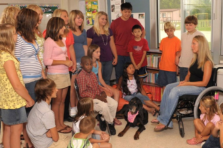 「有次我正奮力翻過三個階梯時,不小心跌坐在地,正巧一個愛嘲弄我的男孩經過。這件事很快傳遍校園,他不斷向大家宣傳,『嘉碧連個樓梯都走不好!』他很賣力地不讓任何人遺忘這件事。