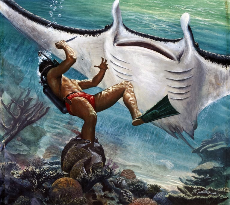 不少人因為蝠魟的外表,往往會將牠與可怕的印象牽連在一塊。圖為 1956年畫家Mort Künstler所繪的圖。