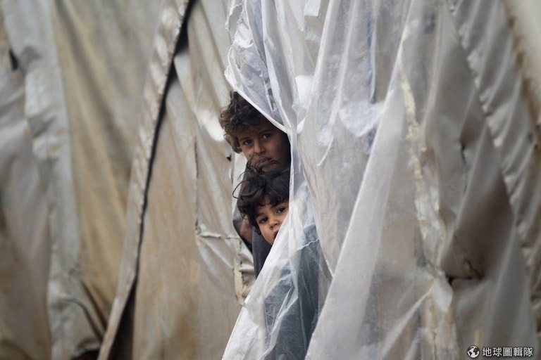 敘利亞小朋友從帳篷中探頭望向攝影師。