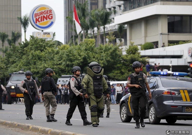 恐攻事件後,印尼政府出動大規模警力維安,同時也派出拆彈小組前往事發地點。