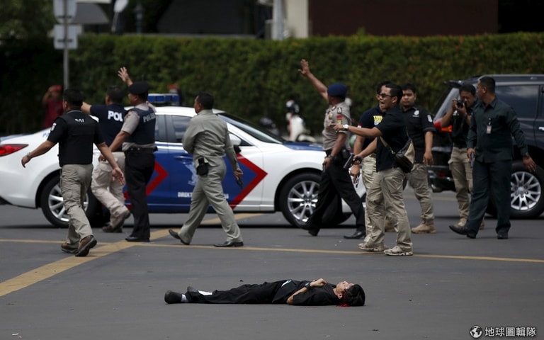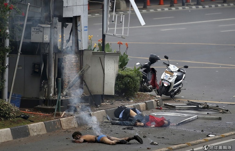 雅加達市區內一處警察崗哨被炸彈攻擊,一旁可見冒著白煙的遺體倒臥地上。
