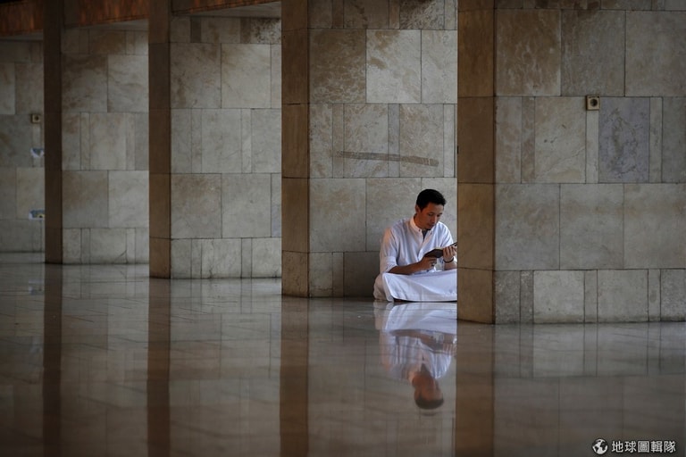 雅加達的清真寺內,一名穆斯林正虔心閱讀。