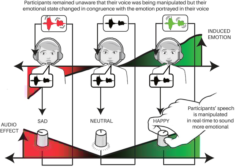 結果研究人員發現,聽到「快樂版」聲音的受試者心情也跟著變得正面,反之聽到「悲傷版」的受試者心情變得沒那麼好。而聽到「恐懼版」的受試者情緒落差則沒那麼明顯。研究報告中提到,就像我們會從他人說話的聲調中去猜測他人的情緒,我們也可以利用相同的方法了解自己,換言之,如果我們說話時聽起來很快樂,我們就會感到快樂。