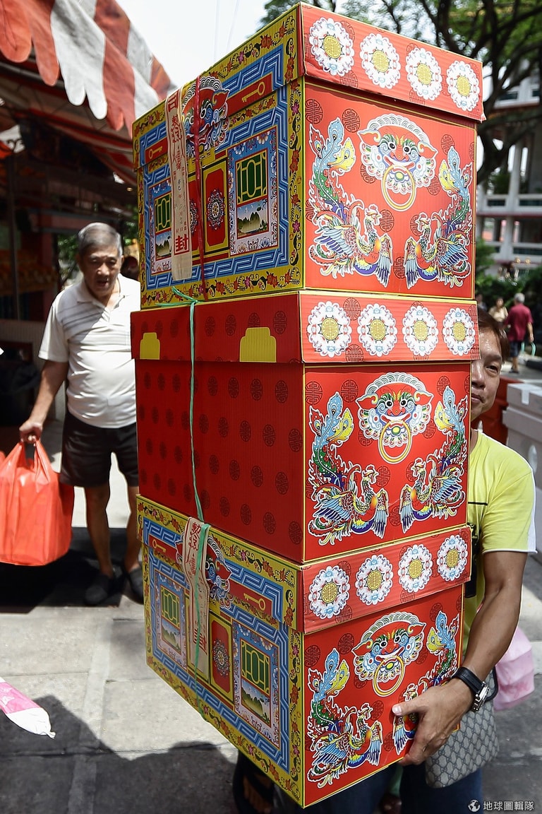 新加坡的祭祀物品排排擺放在長桌上。Suhaimi Abdullah/Getty Images