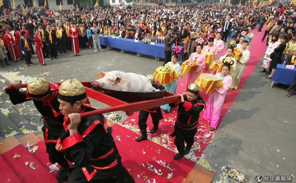成都的祭祖大典上,有豐厚的牲禮。China Photos/Getty Images