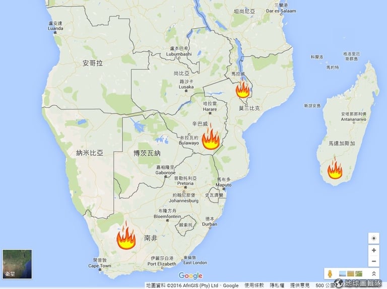 除了南非,其他位在非洲南端的國家深受聖嬰現象衝擊,《路透社》指出,馬拉威是這次乾旱狀況最嚴重的國家,當地有 16%的人口亦即 280萬人將面臨饑荒,不遠處的馬達加斯加也同樣身陷缺糧危機。