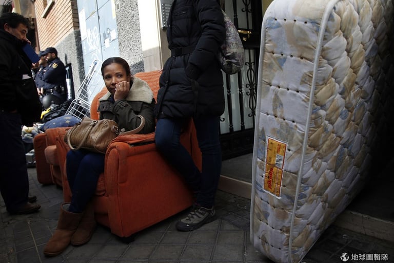 一名繳不起房租被趕出門的女子坐在橘紅色的沙發上。目前,西班牙經濟仍無起色,人民對西班牙首相拉霍伊的信任也瀕臨瓦解。