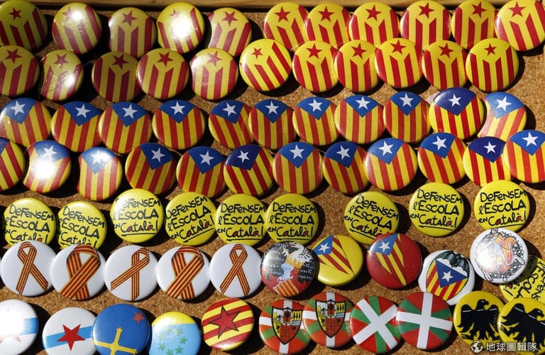 加泰隆尼亞地區要求獨立讓西班牙政府好頭痛。圖為各式各樣支持加泰隆尼亞自治區獨立的徽章。