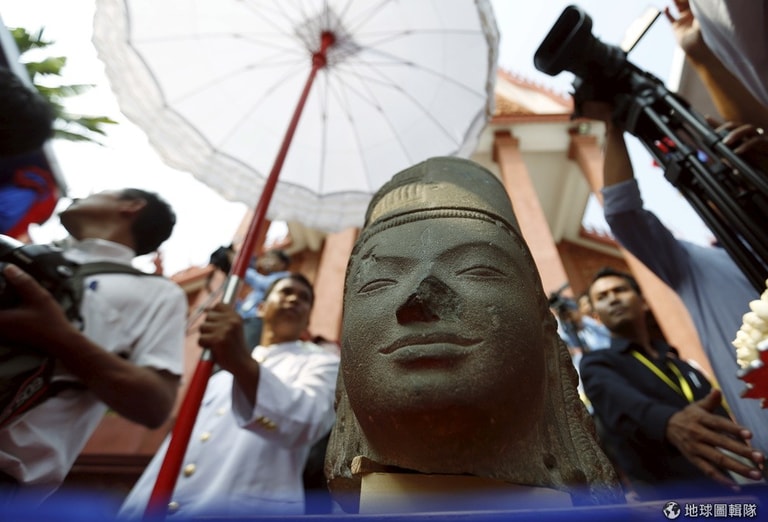 圖為法國在近日歸還給柬埔寨的印度教訶里訶羅神頭像,頭像在 130年後終於回到母國的懷抱。