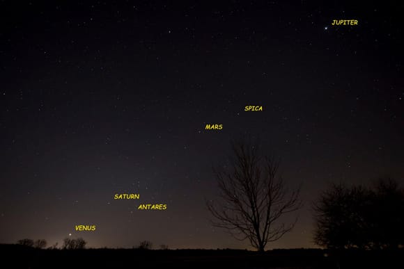 雖說我們只能在黎明破曉前目睹五星連線,但其實五顆行星早在黎明前,就悄悄地在天空中就定位。一開始是由木星先登場,在深夜時從東邊升起,接著,火星會在午夜時分出現,再來分別是土星、金星及水星。水星會座落在最低的位置,約為東南東方位。