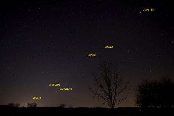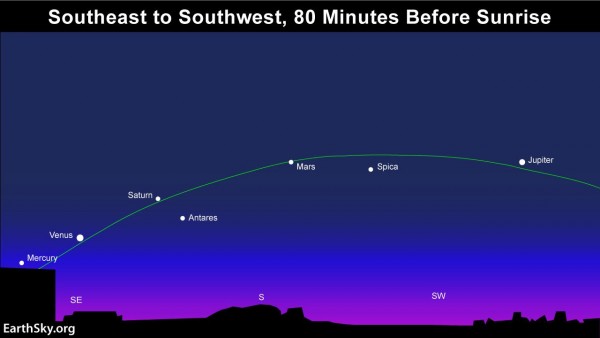 黎明破曉前 80 分鐘,透過肉眼就能在夜空中看到水星、金星、火星、木星及土星等五大行星。