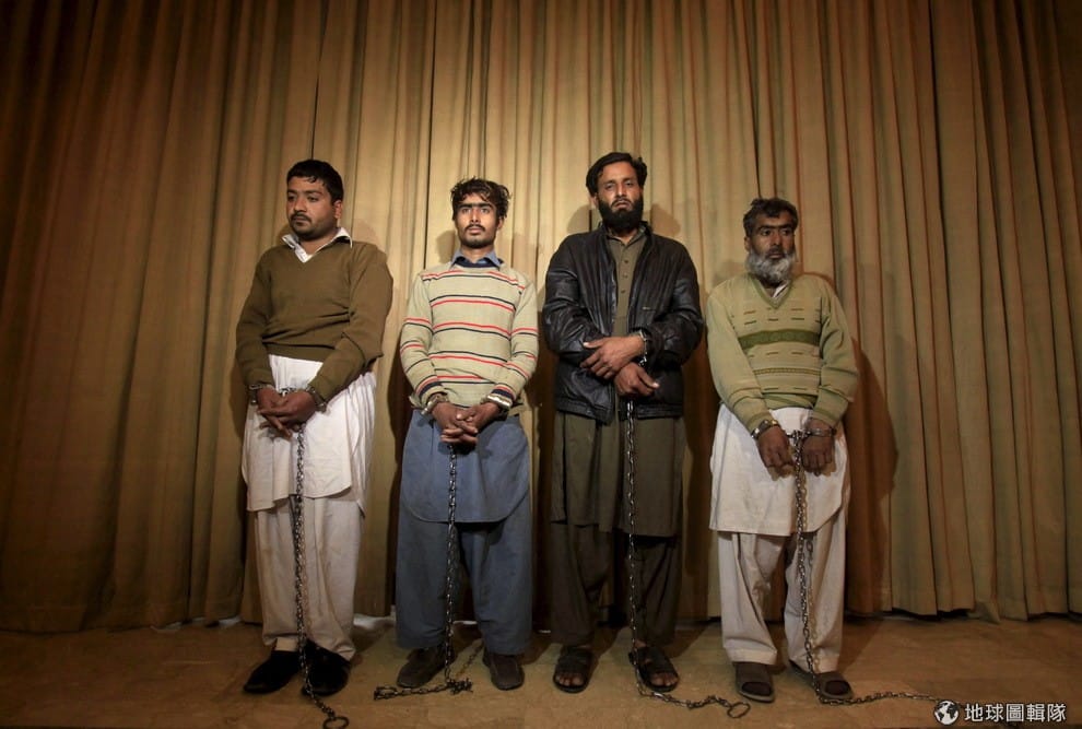 四名男子戴上手銬,站在白沙瓦市的警察總署供媒體拍攝。相傳這四名男子幫助神學士組織向西北部白沙瓦市(Peshawar)的帕夏汗大學(Bacha Khan University)發動恐怖攻擊,造成至少 21人死亡,30多人受傷,隨後槍手全遭軍警擊斃,但全國已經蒙上了恐怖攻擊的陰影。