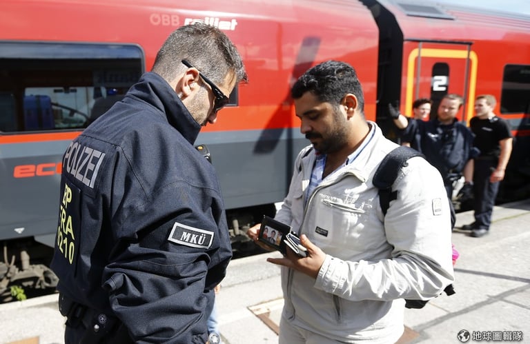 一名德國警察正在對難民實施安檢,擔心有恐怖分子趁亂進入歐洲。