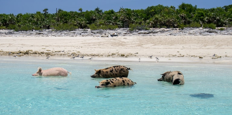 在巴哈馬的大沙洲(Big Major Cay)這裡,你能親眼見證大小豬在海裡閒適地優游模樣。牠們的祖先源頭已經不可考,人們只知道這裡的豬最愛的活動就是下海游幾圈,也因為這可愛的景象讓巴拉馬的大沙洲成了遊客的觀光熱點之一。