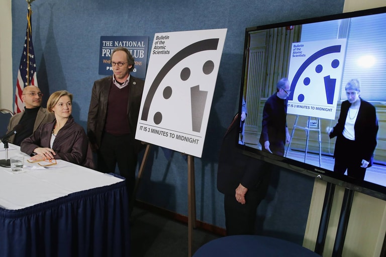 每年,負責編纂美國《原子科學家公報》(The Bulletin of the Atomic Scientists)的科學家們,都會依照國際情勢調整「末日之鐘」,預測全球距離世界毀滅還剩幾分鐘,藉此讓大家重視國際社會受到的威脅。而今年因為核武和氣候變遷的關係,科學家們決定不調整去年設下的紀錄,讓末日之鐘的指針繼續距離午夜三分鐘。