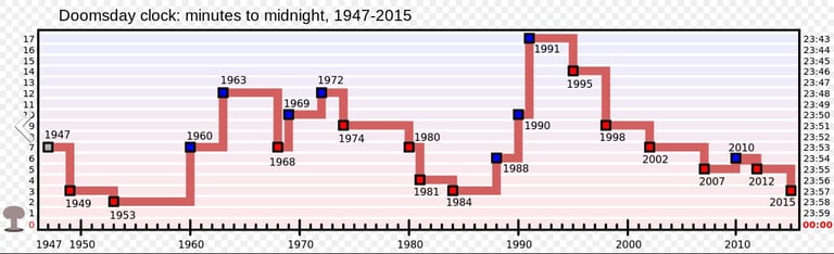 根據《維基百科》,科學家們在 1947年推出「末日之鐘」,標示出世界受核武威脅的程度,午夜零時象徵核戰爆發,科學家們會因應世界局勢將分針撥近或撥離子夜,以此提醒各界正視問題。最近一次調整在 2015年1月22日,目前指針距離子夜僅 3分鐘,和 1984年美蘇冷戰時的距離一模一樣。