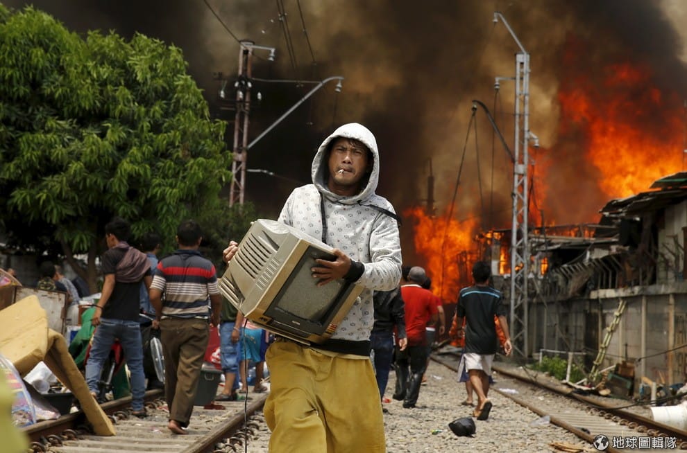 一名男子抱著電視機逃難,他的身後竄起一片熊熊烈火。26號這天,雅加達北部沿著鐵路興建的房舍遭遇大火,民眾倉皇抱著家當逃離,根據當地媒體的資料,共有大約 100棟木造房舍被燒毀,還好無人傷亡。