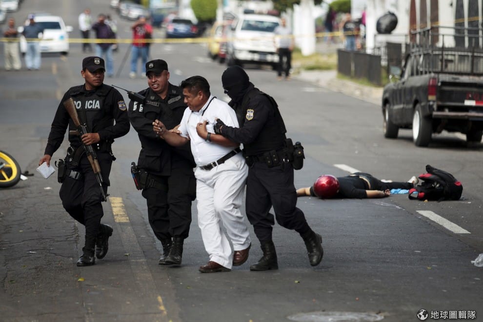 一名父親(穿白衣者)看到兒子倒在馬路上的屍體不敢相信,一旁的警察趕忙將他帶離現場。他的兒子和朋友騎車去工作時,遭到不明人士槍擊身亡。多年來薩爾瓦多街頭殺人案頻傳,也讓薩爾瓦多成了全球最暴力的國家之一。2012年,薩爾瓦多兩大街頭幫派停火協議崩解,街頭殺人案也從這個時候開始不斷增加,讓當局一個頭兩個大。
