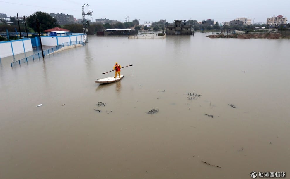 一名身穿橘色工作服的巴勒斯坦民防人員划著小船,想辦法疏散遭洪水侵襲的民眾,當地因為遭逢冬季風暴的緣故,大雨下不停導致洪水來犯,讓民眾不得不逃離家園尋求庇護。