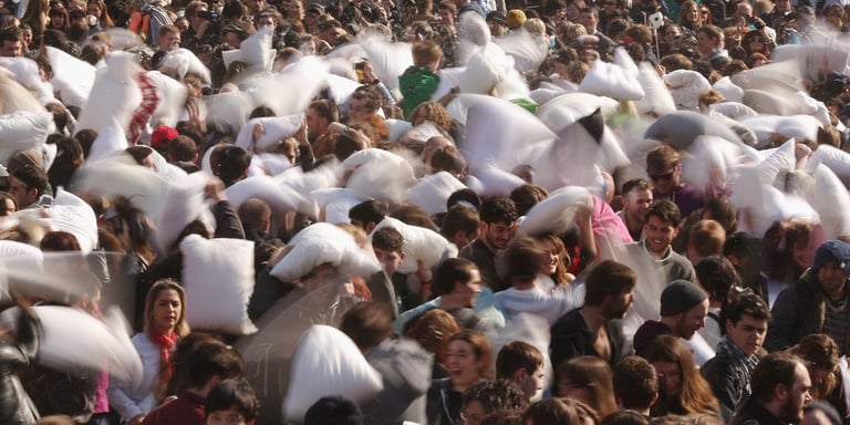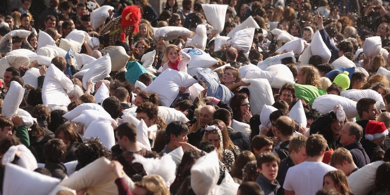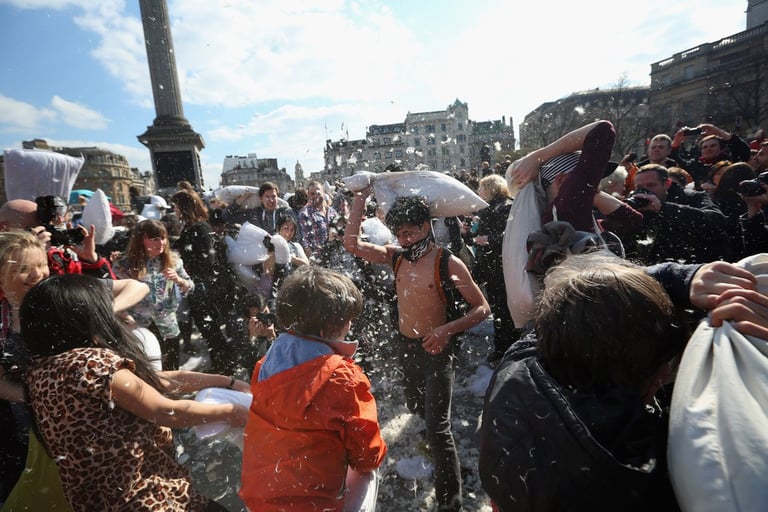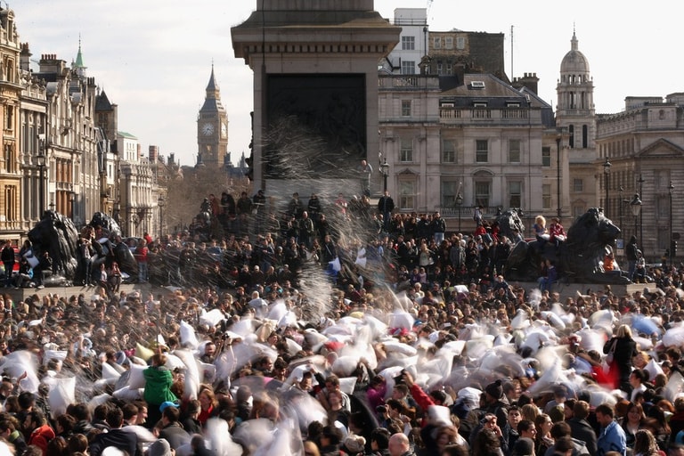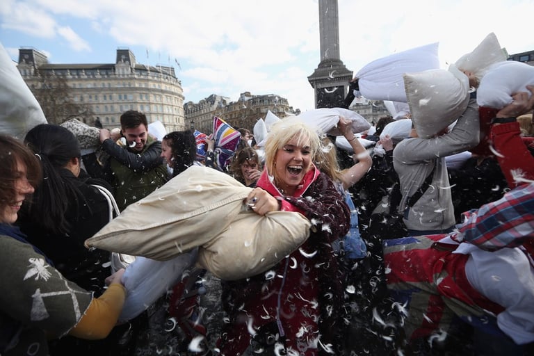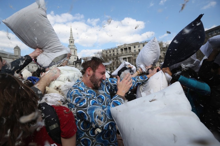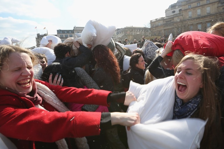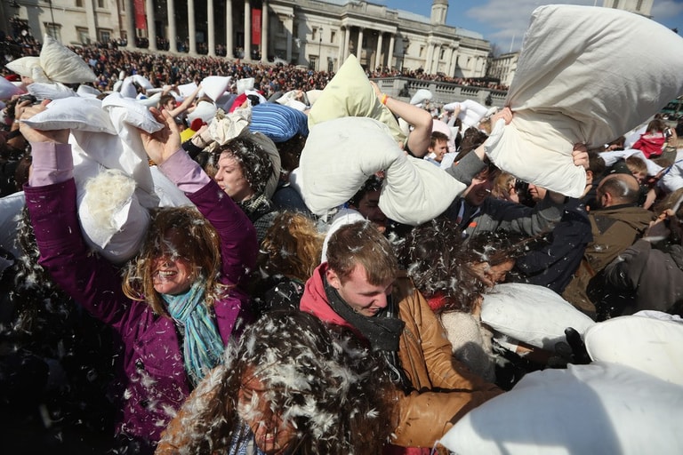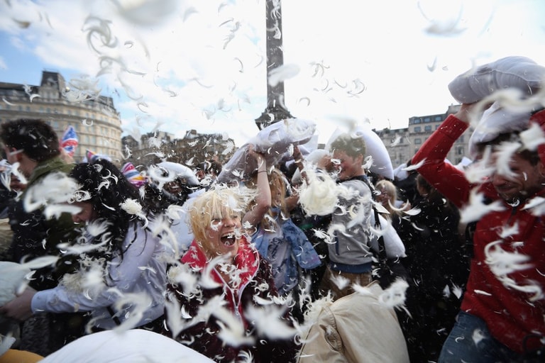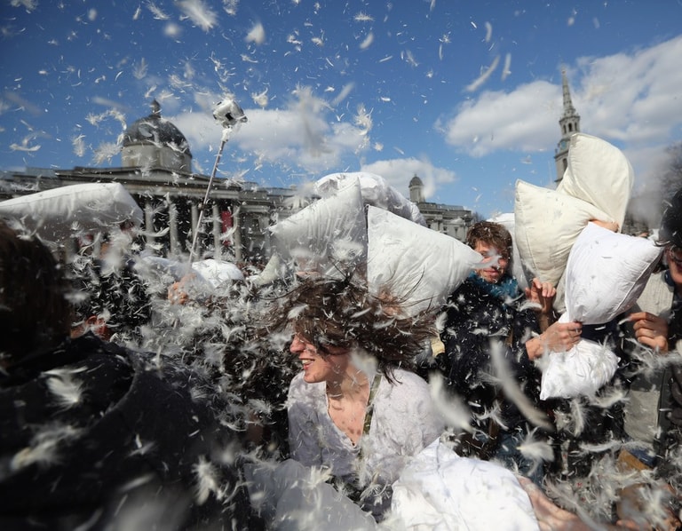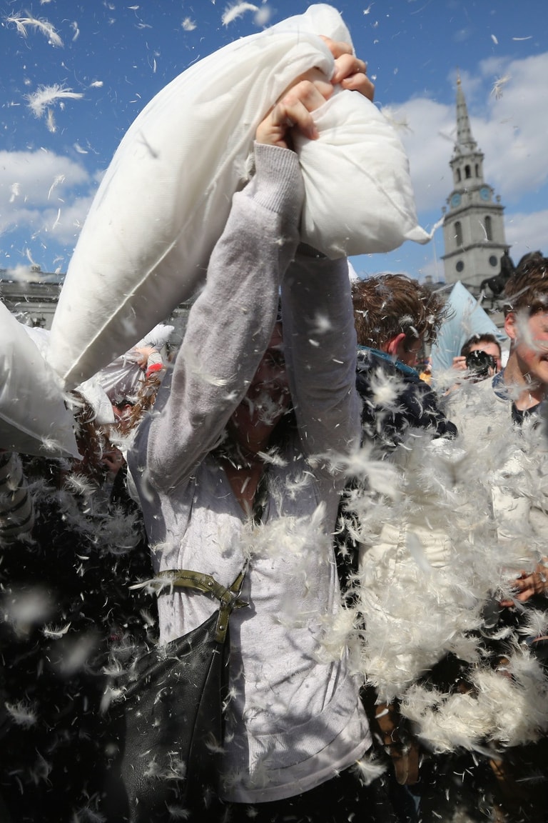 全世界不分男女老少、人人都可參一腳的「枕頭大戰日」又來囉!活動當天,歐洲大城例如阿姆斯特丹、蘇黎世、還有平常給人嚴肅印象的英國特拉法加廣場,擠滿了上千位男男女女,他們全抱著柔軟的白色枕頭「備戰」,待哨音一響,大夥全陷入「互毆」狀態!廣場上瞬間被大笑聲和四散的羽毛佔滿!