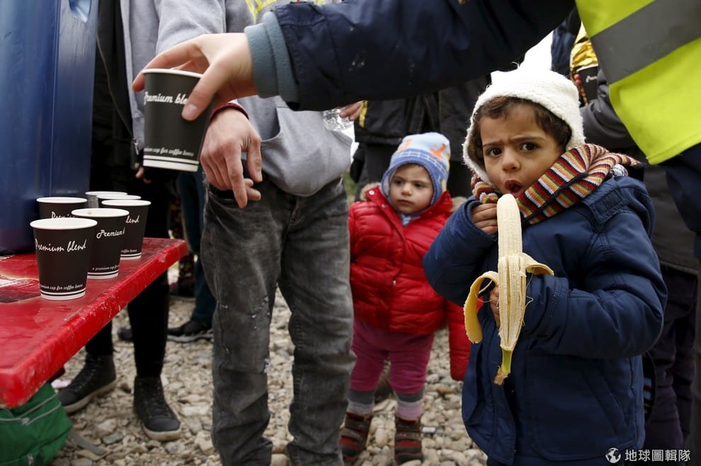 一名難民小男孩吃著香蕉補充能量,一旁還放著熱騰騰的飲料等著供從橡皮艇上岸的難民暖身。