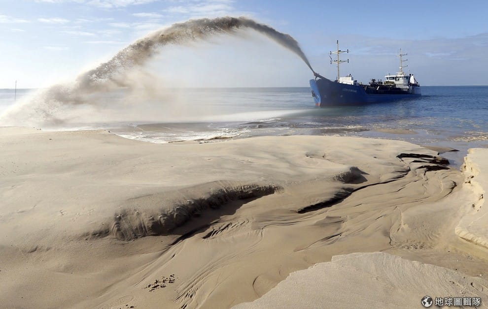 一台運泥船將泥沙以強力水柱的方式,噴向西南岸的的海濱度假勝地阿爾卡雄(Arcachon),讓這個大西洋岸的市鎮不會因為自然侵蝕造成海岸線年年往內縮。