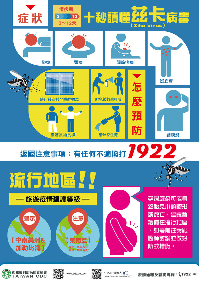 1月10日時,台灣也發現第一個「茲卡病毒」移入案例,根據疾病管制署資訊,一名泰籍男子在桃園機場準備入境時,因為發燒在發燒篩檢站被攔檢,血液檢體經檢驗之後確認感染茲卡病毒。