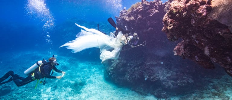 所以,拍攝團隊得小心對待這群嬌客,不要動作太大把牠們給嚇跑,等到現場差不多了,模特兒布瑞克會深呼吸拿掉氧氣罩在水中擺出唯美的姿勢,而Benjamin Von Wong得抓緊這一刻趕緊按下快門。