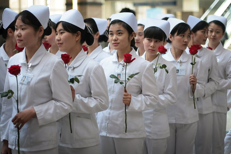 中國人能在德國從事專業護理工作,先決條件是擁有護理本科學歷和德語B2水平,達到條件後才能拿到飛往德國的機票。德方一般委託中方的合作公司完成篩選和培訓工作,比如威海國際經濟技術合作股份有限公司、江蘇國際經濟技術合作公司或者上海外經集團控股有限公司。威海公司下屬的山東省外派護理培訓基地是中國目前最大的護理人員出國培訓地點。基地為希望赴德工作的申請者開設了為期八個月的語言培訓課程,此外還有對德國國情和文化的介紹等內容。