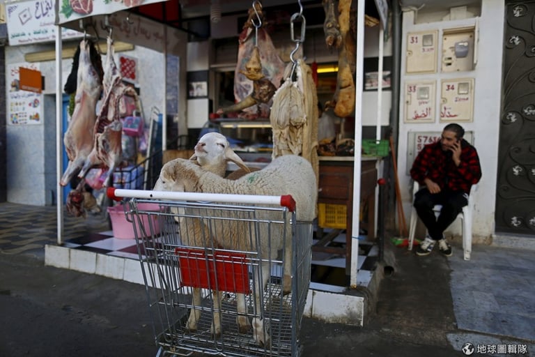 首都突尼斯(Tunis)當地,一間肉販門前停著裝有羊隻的超市推車。