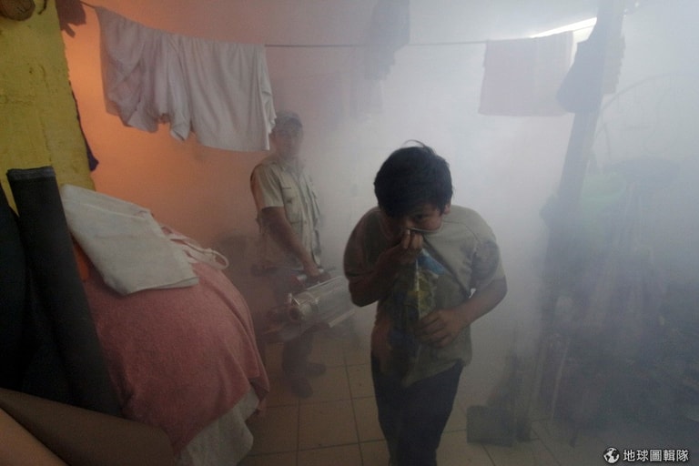 受不了殺蟲劑的男孩,掩著口鼻往房間外走。中南美洲因為茲卡病毒的衝擊,各國都拉警報,並努力撲殺傳染病毒的病媒蚊。