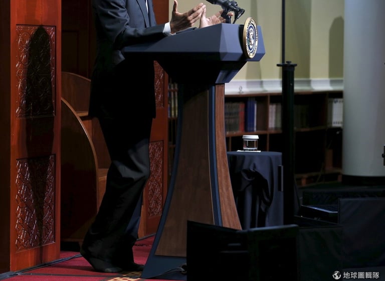 首次進入美國清真寺演講的歐巴馬也遵循伊斯蘭禮節,將鞋子脫下才進入清真寺內。圖為歐巴馬沒穿鞋向穆斯林演講的畫面。