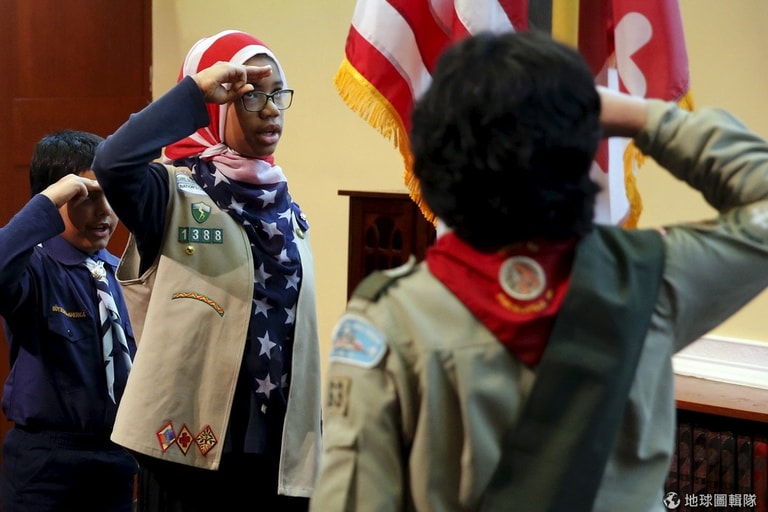 圖為穆斯林童子軍對著美國國旗敬禮展現愛國心。