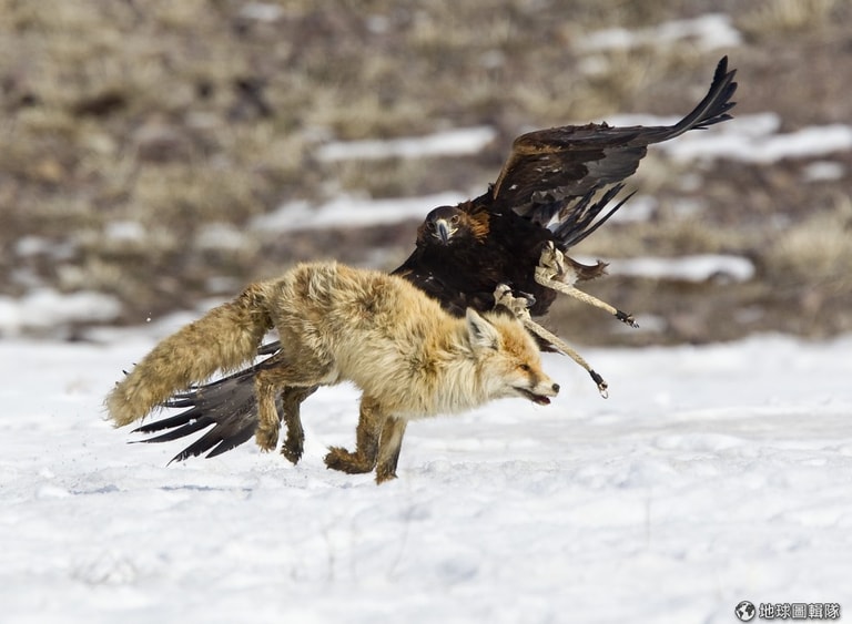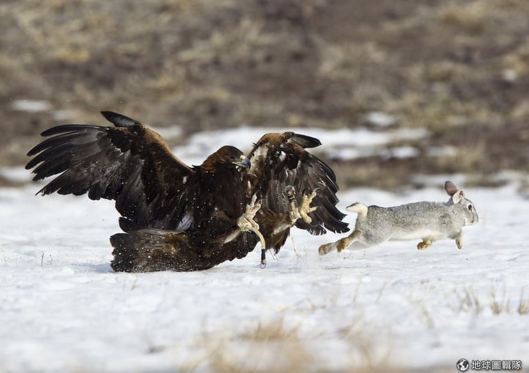 雪下在哈薩克東部的草原,獵人們騎著馬在草地上奔馳,帶著金鵰(Golden eagle)尋找獵物。他們跟著動物在雪地裡留下的腳印一路奔跑,接著放出手臂上的金鵰,讓牠去抓狐狸和兔子,這裡正在舉行哈薩克人的鷹獵比賽。
