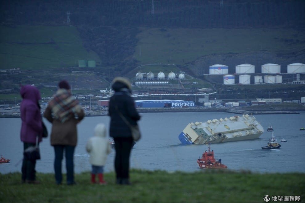 西班牙北邊畢爾包當地,一艘巨型貨船在海水中載浮載沉,當地工作人員正忙著將大船拖向岸邊。