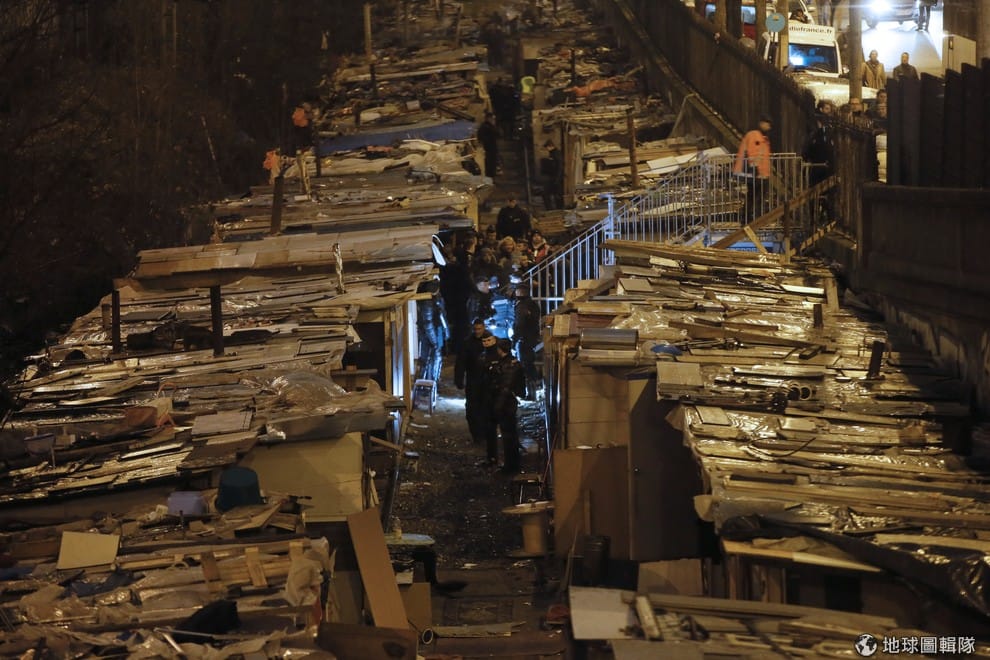 巴黎環城鐵路(La Petite Ceinture)附近,憲兵正在確認搭建物內還有沒有人,這裡原本住有 350名左右的羅姆人(Roma),他們在 2015年夏天被驅逐出臨時住屋區後,只好在廢棄鐵路附近找落腳處。