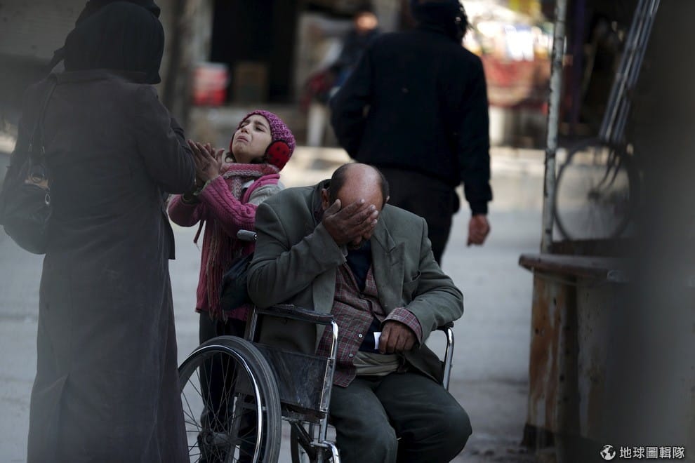 大馬士革東邊的杜馬(Douma)區內,小女孩站在爸爸的輪椅邊向路人求救,希望有人幫忙他們付醫藥費。歐盟各國領導人在 4號時於倫敦召開國際捐助大會。