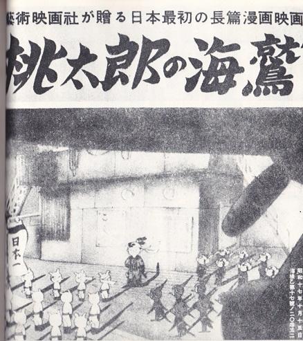事實上,隨著有聲電影面世後,日本國產動畫也經歷一段不敵進口貨的衰退時期,隨著戰間期與國際局勢的緊張,日本於 1939 年制定具有軍國主義色彩的「映畫法」,開始管制外國電影進口量,但也促成日本國內動畫產業的復甦。二次世界大戰期間,日本傾最高之財力物力製作長篇動畫《桃太郎的海鷹(桃太郎の海鷲,1943)》、《桃太郎.海神兵(桃太郎・ 海の神兵,1943)》可說是民族主義與日本帝國主義軍事擴張的代表作品。