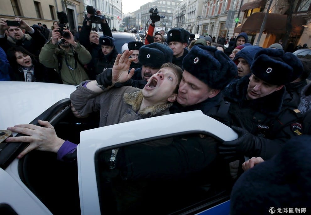 莫斯科市內,抗議債權人的民眾被警方押上警車。