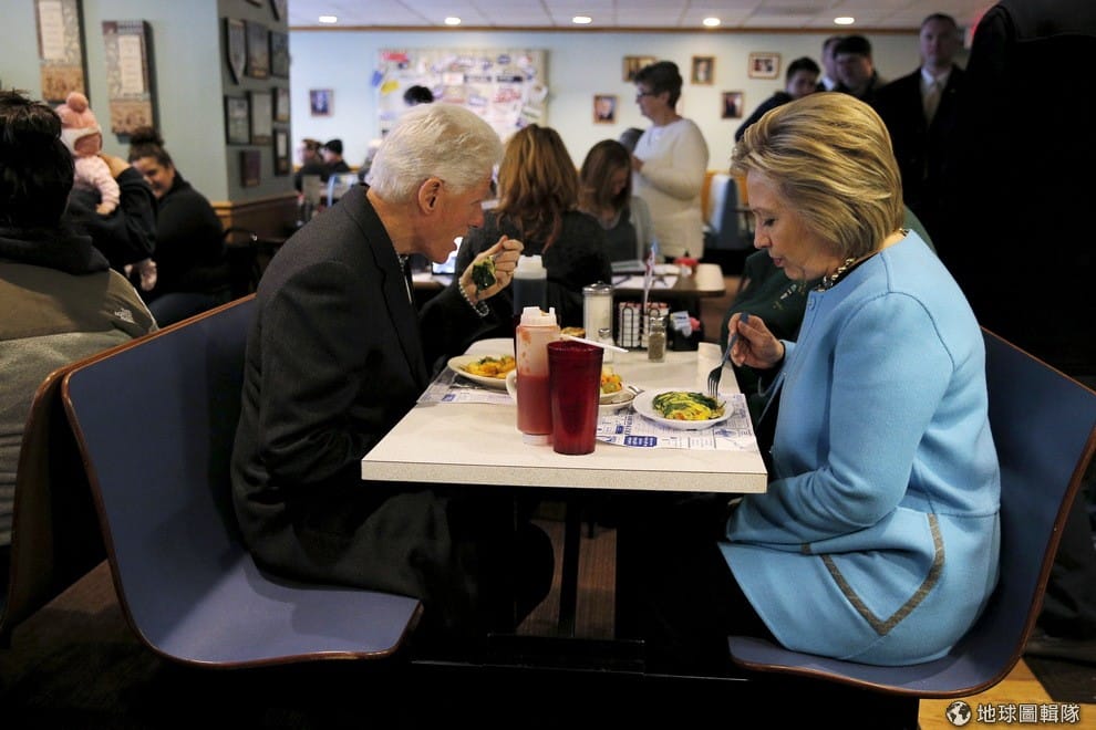 美國總統參選人希拉蕊(右,Hillary Clinton)與丈夫也就是美國前總統柯林頓(Bill Clinton)一起吃早餐。柯林頓夫婦在 2012年時因在國際上為宣導自由理念奔走,被《外交政策》雜誌選為百大思想家。
