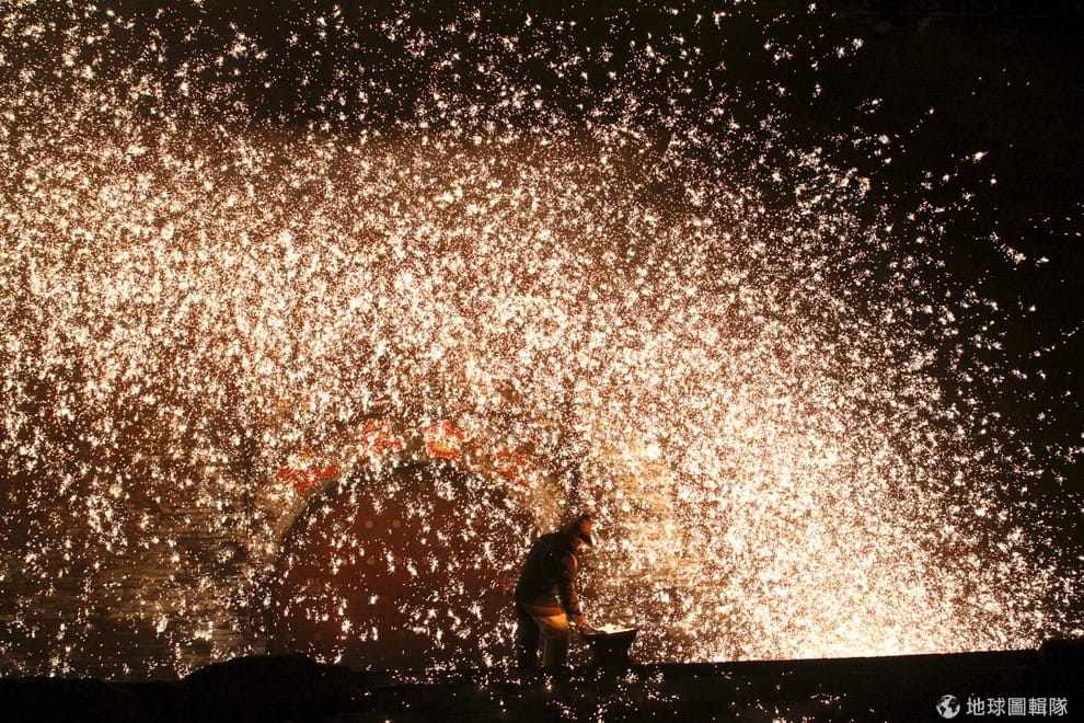 河北省蔚縣的暖泉古鎮,人們正準備替即將到來的元宵節準備火龍。過去 300多年來,暖泉鎮每逢元宵節都會準備舞火龍的傳統活動,居民會拿著攝氏高達 1,300度熾熱鐵塊朝冰冷的水泥牆揮動,製造出火花四濺的景象。